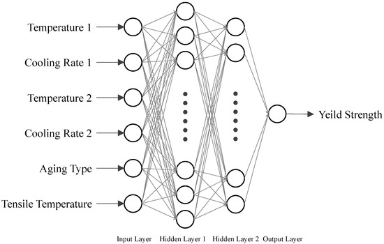 In the exploration of the heat treatment process, the relationship between the microstructure of the material and the heat treatment parameters was identified. The microstructure significantly influences the yield strength of the material. Accordingly, an ANN model was constructed with two hidden layers, utilizing heat treatment parameters as the input parameters and yield strength as the output, as illustrated in Figure 2. Given that this study involves considering a possible three-step heat treatment process, the parameters for the first step are denoted as temperature-1 and cooling rate-1, the second step parameters are labeled as temperature-2 and cooling rate-2, and the third step parameter is referred to as aging type. The tensile temperature represents the experimental temperature at which the predicted yield strength is evaluated.
