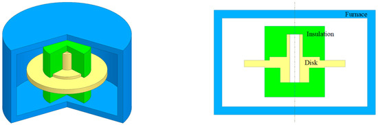 To analyze the impact of strengthening phases on material mechanical properties during the heat treatment process, it is essential to accurately measure the temperature distribution within the turbine disk during heat treatment. Traditional methods using thermocouples are unable to provide comprehensive and precise temperature measurements across the entire turbine disk. To address this challenge, this study employs finite element simulations to model the heat treatment process of the turbine disk and calculates temperature distribution and trends throughout the heat treatment process, providing valuable data for subsequent analysis [23]. The heat treatment model for the turbine disk is illustrated in Figure 3, including the turbine disk, insulation, and vacuum furnace. The DMHT process was analyzed in ABAQUS 2021. The temperature of the heat treatment and the cooling rates, both of which would be input to the ANN model, were calculated by Python scripting in the postprocess.
