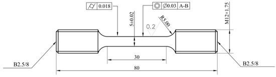 The preparation process of the disk was vacuum argon atomization → hot isostatic pressing → hot extrusion → isothermal forging → dual-performance heat treatment. The heat treatment comprised three distinct steps. First, subsolvus heat treatment at 1120 °C was applied to ensure and improve the stability of the initial structure. Secondly, the disk underwent supersolvus heat treatment at 1200 °C with thermal insulation covering the hub to create a temperature gradient along its radial axis, promoting grain coarsening at the rim while maintaining the fine grain structure at the hub. Finally, aging heat treatment at 815 °C for 8 h improved the mechanical properties of the disk. A series of tensile tests were carried out on samples obtained from different regions of the full-size disk to ensure an accurate representation of the material’s performance. Figure 4 is the sketch of the tensile specimen.