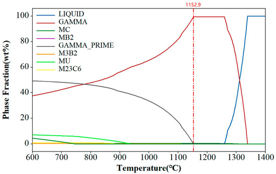 The γ′ phase solvus temperature is dependent on the alloy’s chemical composition and can be calculated using the CALPHAD method. For the FGH4113A alloy, the solvus temperature for the γ′ phase was estimated at 1152.9 °C, as shown in Figure 5. When the heat treatment temperature reached or exceeded the solvus temperature of the γ′ phase, also known as supersolvus temperature, the γ′ phase dissolved and reprecipitated during cooling. Controlling the cooling rate during this process allows for the adjustment of the γ′ phase morphology and size distribution. Rapid quenching leads to the formation of unimodal fine γ′ phases, while slow cooling results in the development of a multimodal γ′ phase distribution [24,25,26,27].