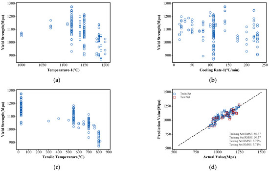 The partial characteristic parameters and tensile strength of the training dataset and ANN model training results: (a) distribution of yield strength with respect to temperature-1; (b) distribution of yield strength with respect to cooling rate-1; (c) distribution of yield strength with respect to tensile test temperature; (d) ANN model training results.