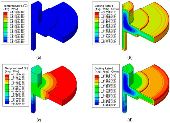 In accordance with the thermal treatment specifications of DMHT, finite element simulations were conducted in two distinct steps. In the first step, a uniform furnace temperature of 1120 °C was applied for the subsolvus heat treatment. Subsequently, oil quenching was performed. The holding stage temperature distribution and oil quenching cooling rate are illustrated in Figure 9a,b.