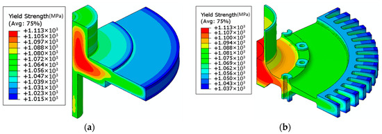 Tensile strength prediction at 550 °C: (a) yield strength of DMHT disk; (b) yield strength of the final shape of the turbine disk.