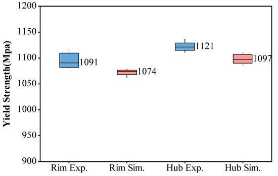 Tensile experiments were conducted at 550 °C on specimens taken from both the hub and rim regions of the final shape turbine disk, and the results were compared with the predicted data. As shown in Figure 12, at the test temperature of 550 °C, the predicted tensile strength in the hub region was 1097 MPa, while the median experimental result was 1121 MPa, indicating a slight underprediction of 24 MPa, an error of 2.1%. In the rim region, the predicted tensile strength was 1074 MPa, compared to the experimental median of 1091 MPa, resulting in a slight underprediction of 17 MPa, with an error of 1.6%. These results demonstrate that the overall trends in the experimental and predicted results were consistent. The errors in the predictions were rather small, indicating that the model’s performance was quite accurate and reliable for predicting the tensile strength.