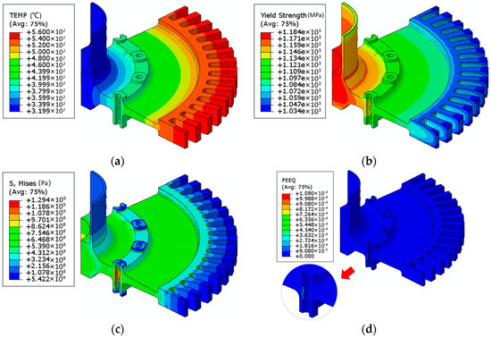 The integrated simulation of FEA and ANN was conducted under low-cycle fatigue experiment conditions of the turbine disk. The turbine disk operated at an actual speed of 15,000 rad/min, with measured temperature distributions of 320 °C at the disk hub and 570 °C at the rim. Temperature distribution and corresponding predicted tensile strength are displayed in Figure 13a,b. The finite element results calculated using the integrated model can effectively capture the uneven yield strength caused by the non-uniform temperature distribution after loading, enhancing the accuracy of subsequent stress calculations. The calculated Von Mises stress results are presented in Figure 13c, and the equivalent plastic strain results are shown in Figure 13d; minor yielding can occur, possibly, at the bolt–hole locations. This approach enabled the prediction of the yield strength distribution under actual working conditions of the turbine disk and the identification of failure regions, providing an efficient means for turbine disk heat treatment design. Additionally, by using the predicted yield strength distribution and stress state under actual working conditions, it is possible to perform topological optimization of the turbine disk geometry to reduce disk weight and enhance material utilization.