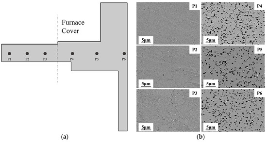 SEM micrographs of FGH4113A dual-performance turbine disk: (a) sampling point of turbine disk; (b) low magnification showing the γ′ size in different regions of the turbine disk.