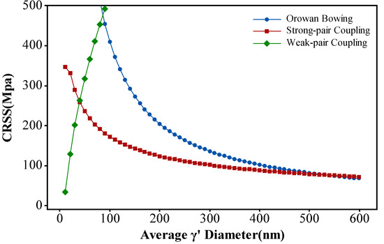 According to the formula, it is evident that the most influential variables affecting strengthening are the size and volume fraction of the γ′ phase. When the γ′ size meets the critical dimension, it activates both the weak-pair coupling and strong-pair coupling cutting mechanisms.