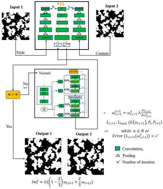 Initially, 100 2D images of the microstructure are used and additionally, 198 other 2D images of the microstructure of the materials are synthesized using transfer learning based on StyleGAN network interpolation and the two-way Gatys model. This approach involves transferring the pre-trained model and dividing the process into two sections: content representation and style representation. In the Gatys method, only the convolution network portion of the transferred model is utilized. This model uses two input images and reconstructs two output images between these images. The schematic of the model used for interpolating and synthesizing the 2D images of the microstructure of materials is depicted in Figure 1. StyleGAN employs an eight-layer multilayer perceptron (MLP) model to map the initial code’s latent vector to latent space. This procedure is added to each convolution layer of the generator model using adaptive instance normalization (AdalN). AdaIN aligns the mean and variance of the content features to match those of the style features, making it a normalization technique. We utilize the two-way Gatys model to optimize the latent space to define the error function. This approach involves transferring the pre-training model and dividing the process into two sections: content representation and style representation. In the Gatys method, only the convolution network portion of the transferred model is utilized. In this model, it is assumed that there are features in the convolutional layer , each with the size of one-dimensional index. Therefore, is defined as the matrix corresponding to the -th layer, where corresponds to the -th filter and -th coordinates. To interpolate between two images and at depths and of , it is assumed that is a latent code or input Gaussian random image to the styleGAN model; the output of the generator is considered as the input image to optimize the latent space in the styleGAN model.