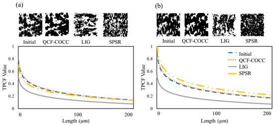 For the isotropic materials, as shown in Figure 5a, the TPCF values for the 2D cut section of the microstructures derived from the QCF-COCC and SPSR methods are relatively similar to the initial input. However, the results for the 2D cut section of the LIG method differ from those of other methods and the initial input.