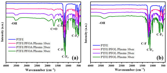 FTIR spectra of (a) PTFE and PTFE/PFOA/N2 plasma and (b) PTFE and PTFE/PFOL/N2 plasma.