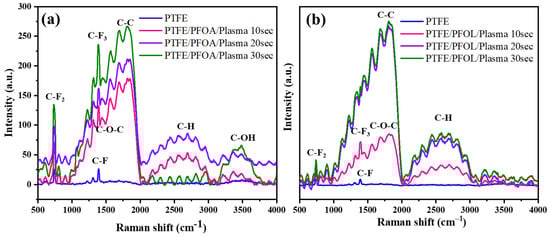 Raman spectra of (a) PTFE and PTFE/PFOA/N2 plasma and (b) PTFE and PTFE/PFOL/N2 plasma.