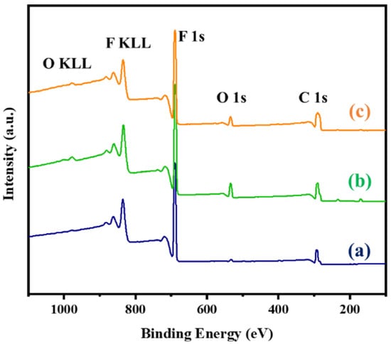 XPS survey spectra of (a) PTFE; (b) PTFE/PFOA/N2 plasma; and (c) PTFE/PFOA/N2 plasma.