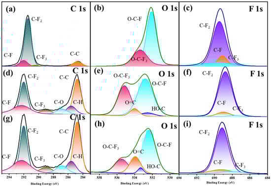 XPS deconvoluted spectra of (a–c) PTFE; (d–f) PTFE/PFOA/N2 plasma; and (g–i) PTFE/PFOA/N2 plasma.