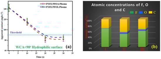 (a) Apparent contact angle values and (b) atomic concentration of (I) PTFE, (II) PTFE/PFOA/N2 plasma, and (III) PTFE/PFOA/N2 plasma.