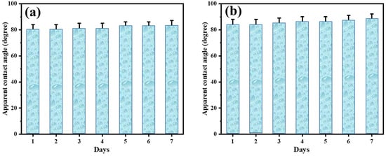 The study investigated the efficacy of two methods, PFOA and PFOL modification and N2 plasma treatment, in altering the surface properties of the PTFE membrane. The modified PTFE after fluoro-compound coating and N2 plasma treatment showed the lowest apparent contact angle, measuring at 79° (for PTFE/PFOA/N2 plasma) and 84° (for PTFE/PFOL/N2 plasma). To evaluate the durability of these modifications, apparent contact angles were measured daily for one week. The apparent contact angles increased slightly to 83° and 86° for the PTFE/PFOA/N2 plasma and PTFE/PFOL/N2 plasma-treated membranes, respectively, indicating sustained hydrophilicity (Figure 9a,b). This suggests that both methods create a long-lasting hydrophilic coating on the PTFE surface, with potential implications for various applications.