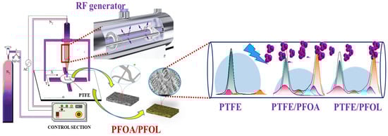 Modification of PTFE was executed using two distinct processes: immersion in perfluorooctanoic acid (PFOA) and plasma treatment. To begin, a PTFE sheet measuring 10 × 10 cm was immersed in a 10% PFOA solution contained in a large petri dish. The sheet was carefully placed to ensure it was fully submerged without any folds, resulting in a fully wetted and transparent appearance. After 10 min of immersion, the PTFE sheet was removed and laid flat to dry in the open air. During the drying process, the transparent sheet gradually regained its original texture and color. Once the PTFE was completely dry, it was prepared for the second modification stage involving N2 plasma treatment. For the plasma treatment, the dried PTFE sheet was positioned on the sample holder of the plasma equipment, ensuring secure placement. Based on prior research [], it was established that using nitrogen (N2) as the active gas with a 2-min plasma exposure effectively produced a hydrophilic surface. Accordingly, the procedure was replicated here, with specific flow rates set at 4.5 L/min for the carrier gas (argon) and 20 mL/min for the active gas (nitrogen), with an RF power of 150 W and maintaining the distance between the plasma nozzle and Teflon sheet to 3 mm. Three different plasma exposure durations—10, 20, and 30 s—were applied (as illustrated in Scheme 1). Immediately after plasma treatment, the modified PTFE was sealed in a zipper bag to prevent contact with the atmosphere. A similar protocol was followed for PTFE modification using perfluorooctyl acrylate (PFOL). All modified samples were meticulously packed and subsequently subjected to a series of characterizations to assess their properties.