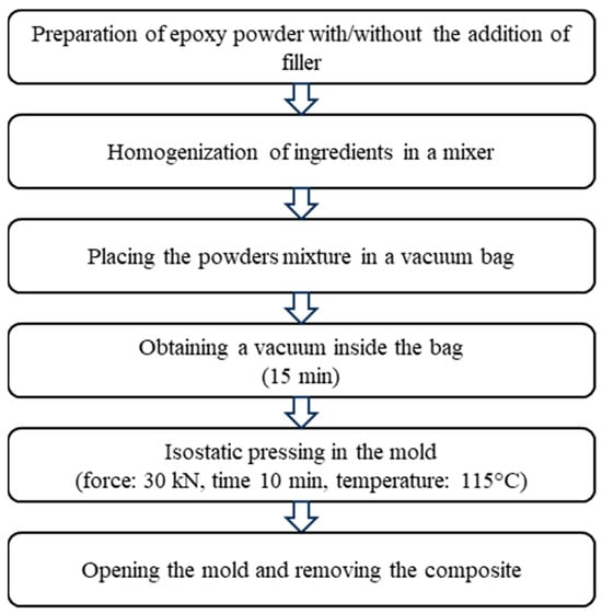The procedure for producing composites using the isostatic pressing technique is shown schematically in Figure 1. In the first stage, a mixture of epoxy powder and graphite filler was prepared using a VH type mixer (time 15 min, mixer revolutions 300 rpm, device revolutions 30 rpm, counter-rotating movement). The mixer parameters ensured homogeneous distribution of powders in the volume and no lumps of stuck resin. A portion of the epoxy powder with added graphite was placed inside a vacuum bag and then hot isostatically pressed (pressure force 30 kN, time 10 min, temperature: 115 °C). After completing the isostatic pressing, the vacuum pump was disconnected, and the mold was opened when the composite reached a temperature of 30–40 °C. In this way, flat panels with dimensions of 400 × 400 × 5 mm were obtained.