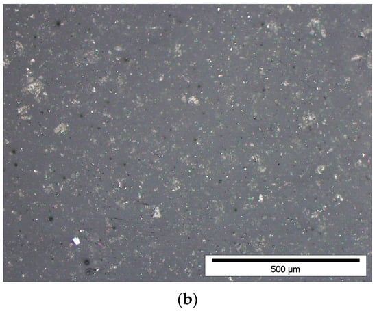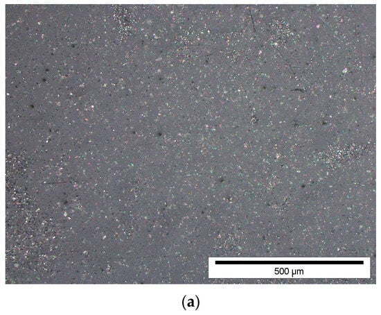 Figure 2 presents images obtained using the optical light microscopy technique. One representative sample was selected for each graphite filler for a size of approximately 10 μm (Figure 2a) and for a size of approximately 45 μm (Figure 2b). In the figure, the white areas are the graphite filler, the black dots are the porosities, while the gray background represents the composite matrix. The cross-section of the material allows for a uniform distribution of the graphite filler in all samples and no tendency to agglomeration of graphite particles. In the case of casting processes with liquid epoxy resins, there are known problems with obtaining a uniform distribution of powder fillers, mainly due to sedimentation occurring under the influence of gravity [40]. The production of composites using single-component epoxy powders allows for high material homogeneity because there is no intensive movement of fillers during production. The occurrence of internal porosities whose size does not exceed 5 μm was observed. The acquired images were analyzed quantitatively to ascertain the percentage of surface coverage of graphite particles within the epoxy resin matrix. The results of quantitative image analysis are summarized in Table 2.