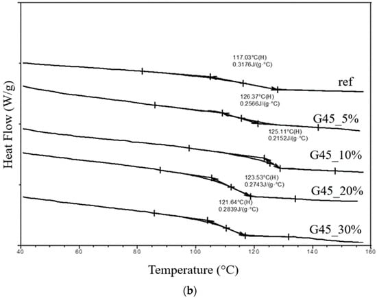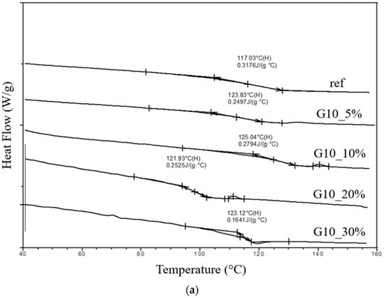 The results of the DSC analysis allowed for the determination of the glass transition temperature Tg of the composites. Determining the glass transition temperature is important and allows us to specify the thermal resistance in the actual conditions of use of the material. Exceeding the glass transition temperature may result in a loss of thermal stability of the material and affect the behavior of the material, which is hard and stiff below the Tg and above it becomes more flexible and viscoelastic. Moreover, materials with a high glass transition temperature are often characterized by better chemical resistance and have a longer service life. The glass transition temperatures included in Table 3 and showed in Figure 3 were determined by the DSC method using a heating rate of 20 °C/min for a temperature range of 40–180 °C. The test results indicated that the Tg temperature for unfilled epoxy resin is 117 °C, and the addition of fillers contributes to a rise in the glass transition temperature, which is a beneficial phenomenon. Similar behavior of the resin after adding carbon fillers was described in publication [43], where Yang showed that a well-dispersed filler in the polymer matrix contributes to an increase in Tg as a result of appropriate connection between resin and graphite. This interaction leads to a reduction in the mobility of the polymer chains, which leads to an increase in the glass transition temperature. Analogous results were obtained in [44], where the amount of filler to the epoxy matrix reduced the heat of reaction (ΔH) while increasing the glass transition temperature of the composite. Article [45] also reported an increase in Tg after adding graphite to the polyester composite matrix. A strong relationship was demonstrated between the filler surface and the matrix, where raising the surface area increases the glass transition temperature, owing to the existence of -OH and -COOH functional groups on the surface. The functional groups described limit the mobility of polymer chains in the epoxy mass. The size of the filler particles is also crucial, as introducing larger particles into the polymer may lead to more significant alterations in the glass transition temperature compared to smaller particles due to the potential restriction of polymer chain mobility by larger particles [46].