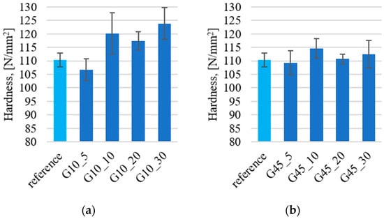 The addition of 5% by weight of graphite does not result in substantial changes in hardness. The addition of graphite filler size above 45 μm (Figure 4b) does not significantly increase the hardness of the material. This may confirm that too small a quantity of particles in the matrix does not contribute to changes in the polymer network, which affects the change in hardness.