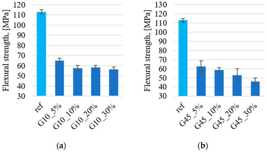 The flexural strength was determined, shown in Figure 5. The results were obtained using a support spacing of 60 mm and a strain rate of 5 mm/min. Both smaller graphite particles with a size above 10 μm (Figure 5a) and larger particles with a size above 45 μm (Figure 5b) contribute to the reduction of the flexural strength. The decrease in strength is large and amounts to approximately 50% for all samples with the addition of graphite. The addition of 10 μm graphite, irrespective of the percentage addition by weight, reduces the strength from 110 MPa to approximately 60–65 MPa. In the case of graphite filler above 45 μm, a proportional decrease in flexural strength is observed in relation to the percentage of graphite. The introduction of fillers results in the formation of internal notches and porosity within the material, which further diminishes mechanical strength. In [50], González García describes similar changes in flexural strength after adding graphite filler to the polyester matrix, explaining the decrease in strength with the unfavorable effect of filler particles on the polymer cross-linking process. Similar behavior was observed and described in publication [51], where Debelak explains the decrease in the flexural strength of the composite due to the low mechanical strength and inadequate interphase connection of graphite crystallites.