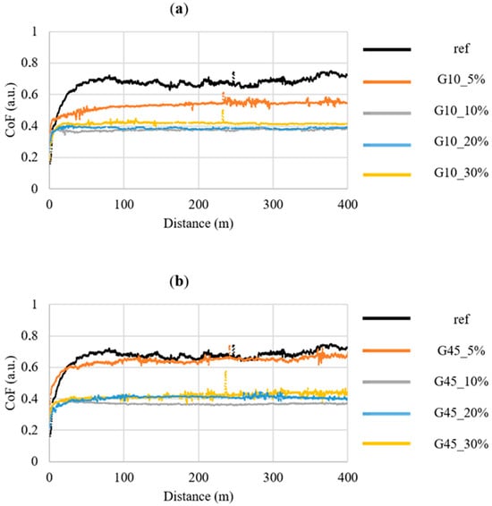 Curves of dynamic coefficient of friction vs. sliding distance for the composites containing graphite: (a) about 10 μm; (b) about 45 μm.