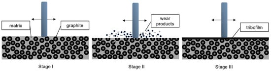 The observations of the behavior of materials during friction allowed us to confirm the model of the creation of a transfer film. It was proven that the friction behavior of the composite with graphite addition exhibits a three-stage nature, as shown in Figure 8. In the first stage, the counter-sample material contacts the composite, and both materials move in a back-and-forth motion relative to each other. In the second stage, the mutual movement of materials leads to the wear of the composite, and there is a gradual loss of the filler and matrix as a result of shearing of irregularities. At this stage, the friction coefficient changes and increases. In the third stage, after the formation of the tribofilm, the friction coefficient stabilizes, and further abrasive wear is reduced to a minimum.