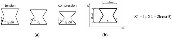 Functional relationships for the relative change in dimensions in the vertical direction, i.e., ΔX2/X2 = f(Δθ) (Table 1), yield a value between zero and one in compression. Meanwhile, in tension, the change ΔX2/X2 yields values between zero and the maximum value. It should be added that the condition θ0 – Δθ = 0° entails the disappearance of the re-entrant cell because it turns into a rectangle.
