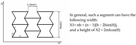 The smallest symmetrical segment of the structure and its dimensions (n = 2, m = 2); X1 = 3h-2lsin(θ) and X2 = 4lcos(θ).