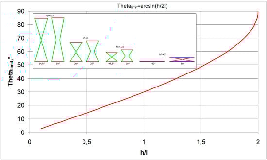 Relationship between the (h/l) ratio and the maximum value of the theta angle in compression () and a graphical illustration of the limit values of the angle θ for four different values of the parameter h/l.