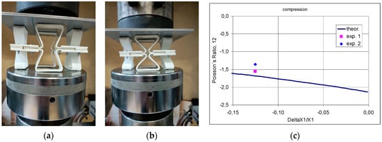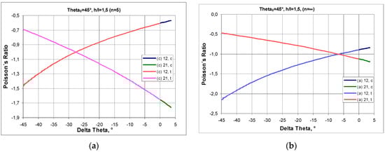 When n = 5, the same relative horizontal and vertical expansion is obtained in tension for Δθ = −27.5° (Figure 5a), which corresponds to a Poisson’s ratio value of −1.