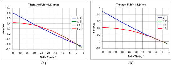 The graphical relationships below are for very small changes in the delta theta angle Δθ, which also indicates small changes in the size of the structure. Using Equation (5) yields approximate values, but lower than those given by the exact Equation (1)—Figure 9a. Apart from this, the relationship obtained from Equation (5) is independent of the change in theta angle accompanying the deformation of the structure (Figure 9b).