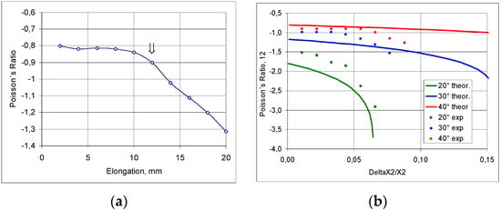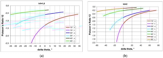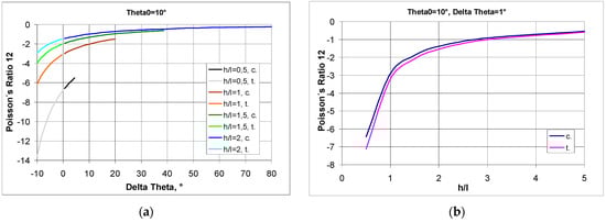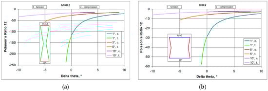 The above relationship indicates that high Poisson’s ratio values are obtained for low values of h/l (Figure 7a) and for small values of angle change (Figure 7b). With compression, the Poisson’s ratio becomes larger with an increasing angle change Δθ.