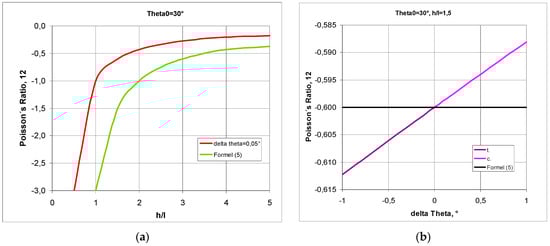 Comparison of the Poisson’s ratio curves as a function of the h/l ratio for changes in Δθ = 0.05°, and Poisson’s ratio as a function of changes in Δθ (delta theta) for h/l = 1.5, obtained from the exact and the approximate Equation (5).