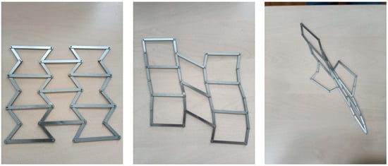 In the theoretical considerations presented here, changes in the dimensions of the structure occur as a result of the hinge mechanism, mainly due to the coordinated movement of the inclined struts. The term hinge used in the literature to describe this process refers to the free rotation of the struts at their contact points. Since in physical structures, there are no pivot axes but rigid–flexible strut joints, other mechanisms leading to changes in the structure dimensions are mentioned, namely bending at the strut joints, as well as the bending of the struts themselves, and their tension and compression, which in macroscopic terms means the collective movement of the bow-tie elements in the structure. In general, the changes in the structure’s dimensions are not only the result of changes in the theta angle but can also be due to changes in the shape and dimensions of the struts.