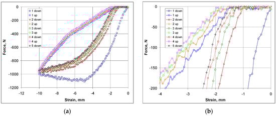 In a second series of tests, the meshes were subjected to maximum tensile loads. Very high elongations in the vertical direction ΔX2/X2 were obtained in this case—Figure 20a.