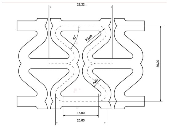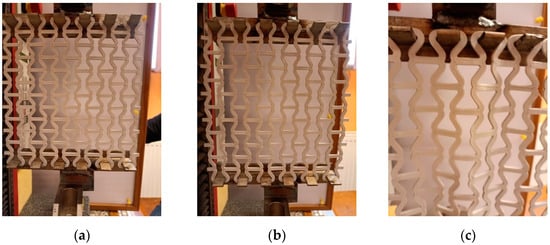 In tension, an increase in the spacing of the inclined struts (Figure 18b) and horizontal expansion of the mesh was observed. As a result, each unit cell expanded in all directions. The main mechanism of structural deformation is the bending of the arched strut joints. However, with the elongation exceeding 15/185 (for θ0 = 40°), a ripple effect occurred and measuring the dimensions of the structure in the horizontal direction (X1) became problematic. Elongation up to approximately 20/185 remained reversible, although certain inhomogeneities were created (Figure 18c). This deformation occurred mainly in the central rows of the mesh. Similar effects have already been observed in other studies [10,54].
