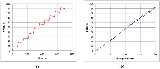 Tensile test results of meshes with elongation in relation to tensile load—(a), and images of meshes subjected to tension—(b).