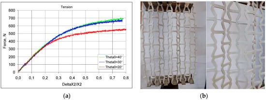 By comparing the experimental results with the theoretical calculations, it is possible to determine the accuracy of the predictions. Theoretical calculations show that, for the meshes under consideration, full straightening of the inclined struts of the re-entrant cells takes place at specific values of ΔX2/X2, which is 86.4% for θ0 = 40°, 56.4% for θ0 = 30°, and 32.3% for θ0 = 20°. Such points are absent, however, from the experimentally obtained curves. The accompanying photographs (Figure 20b) show the processes involved in stretching the meshes: the straightening of the inclined struts and the aforementioned rippling of the mesh. The modified re-entrant structures also exhibit expansion in the direction perpendicular to the tension, thus achieving auxetic behaviour.