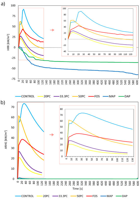 During the MLC tests, the refractory properties of the modified samples improved significantly compared to the control samples. All samples were subjected to a heat flux of 35 kW/m2 (Figure 2a,b). Tracing the HRR curve, it was easy to observe that the rapidly increasing value at the beginning of the combustion process is typical for thin materials [36,37,38]. The peak heat-release rate [kW/m2] and the heat-release rate [kW/m2] were directly dependent on the type of modifying agent used. As their content increased compared to the control samples, the PHRR and HRR values decreased (Figure 2a). Compared to unprotected cellulose, analysis of the PHRR values with 42.9% DAP applied showed a reduction in the peak value of about 75%. Similar observations were made toward MAP-protected samples (peak value reduction of about 75%). For the ARHE [kW/m2] curve (Figure 2b), the average heat-release rate was highest for the control sample, and the lowest values were recorded for MAP- and DAP-protected samples.