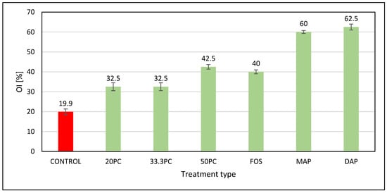 It was assumed that obtaining a value of the OI > 25% would allow us to classify the formulations used on the cellulose as flame retardants. Values of OI < 25% consider the tested samples to be flammable [26,27,43]. The properties of the samples, when their flammability was determined by the OI (Figure 3) method, showed that the CONTROL sample was flammable, with an index of 20%. In the case of the protected samples, the index values represented more than 25%, which made it possible to indicate that a lack of flammability characterizes all samples. The highest rate was recorded for DAP and was 62.5%. Thus, the highest effectiveness of this safety measure is once again confirmed.