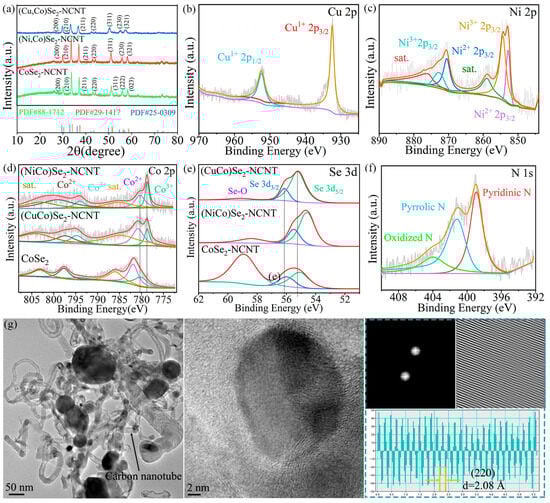 Physical and chemical property analyses of CoSe2-NCNT, (NiCo)Se2-NCNT, and (CuCo)Se2-NCNT: (a) XRD patterns, XPS: (b) Cu 2p of (CuCo)Se2-NCNT, (c) Ni 2p of (NiCo)Se2-NCNT, (d) comparison of Co 2p of three samples, (e) comparison of Se 3d, (f) N 1s of (CuCo)Se2-NCNT, (g) TEM, (h) HRTEM, (i)corresponding Fast Fourier transform patterns of (CuCo)Se2-NCNT.