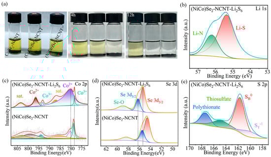 To compare the adsorption capacity of the three materials for LiPSs, equal amounts of (NiCo)Se2-NCNT, (CuCo)Se2-NCNT, and CoSe2-NCNTy were added to Li2S6 solution, and the color change was recorded. As shown in Figure 3a, the solution containing (NiCo)Se2-NCNT began to fade first, suggesting the best adsorption effect, followed by (CuCo)Se2-NCNT. The (NiCo)Se2-NCNT after adsorption was analyzed by XPS. Figure 3b shows that a Li-N bond is formed between the catalyst and Li2S6 besides the Li-S bond of Li2S6. Furthermore, as displayed in Figure 3c,d, after adsorbing Li2S6, the peak of Co 2p moves towards lower binding energy, while the peak of Se 3d moves in the direction of higher binding energy compared to the pristine sample, indicating the occurred chemical interaction of (NiCo)Se2-NCNT and LiPSs as the electron transfer between them []. In addition, the S 2p XPS (Figure 3e) displays the existence of polythionate and thiosulfate, suggesting the oxidation of polysulfides, which is conductive to anchoring LiPSs.