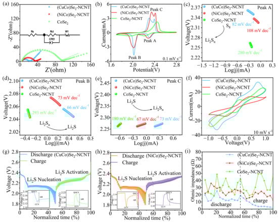 Catalytic performance analyses: (a) EIS, (b) CV at 0.1 mV s−1, Tafel curves of (c) Peak A, (d) Peak B, (e) Peak C, (f) CV of Li2S6 symmetrical cell at scanning rate of 10 mV s−1, GITT plots of Li-S batteries with (g) (CuCo)Se2-NCNT, (h) (NiCo)Se2-NCNT, and (i) comparison of impedance during charging–discharging.