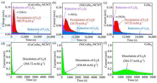 Potentiostatic discharging curves of Li2S8 solution on different catalysts at 2.05 V: (a) (CuCo)Se2-NCNT; (b) (NiCo)Se2-NCNT; (c) CoSe2-NCNT, potentiostatic charging curves of Li2S8 solution at 2.4 V on different catalysts: (d) (CuCo)Se2-NCNT and (e) (NiCo)Se2-NCNT, (f) CoSe2-NCNT.
