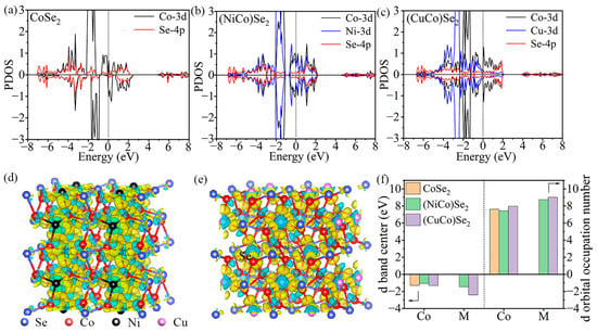 Theoretical analyses of d orbital electronic structure. DOS of: (a) CoSe2, (b) (NiCo)Se2, (c) (CuCo)Se2, Electron density difference of (d) (NiCo)Se2, (e) (CuCo)Se2, (f) Comparison of d orbital electronic structure parameters.