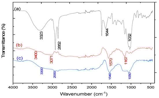 The FTIR spectrum for SCGs (a). AC before (b) and after dye adsorption (c).