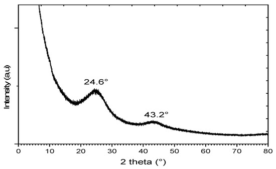 The X-ray diffraction was used to study the existence of crystalline structures and the amorphous nature within the AC matrix (Figure 2). The powder spectrum obtained revealed two diffraction peaks at about 2θ = 24 and 44°, as is usually observed for AC prepared from different sources, indicating that the activation process was successful [42,46,47,48]. The peaks observed are generally associated with the (002) and (100) reflection planes of graphite. However, as can be seen, the diffraction peaks are quite broad, suggesting that the structure of the prepared AC consisted of small crystalline phases dispersed in large disordered zones.