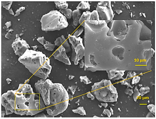 SEM analysis provided useful information on the shape, size and structure of the AC powder particles (Figure 3). The irregular-shaped particles showed a polydisperse size distribution with dimensions ranging mainly from about 20 to 100 µm. In addition, SEM images enabled us to characterize the porous structure generated during the acid activation and pyrolysis processes. The outer surface of the particles had a macroporous morphology with cavity smaller than 20 µm. The enlargement in Figure 3 shows that interconnection by smaller pores in the cavities ensures the penetration and transfer of low-molecular-weight molecules from the surface to the inner microporosity of the adsorbent.
