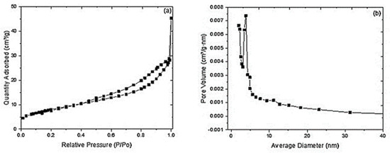 Activated carbons are porous substances with a wide variety of pores ranging from macropores (>50 nm) to mesopores (2–50 nm) and occasionally a small number of micropores (<2 nm), depending on the activation process [29]. Gas adsorption—in particular, nitrogen adsorption at 77 K—is a commonly used method for studying the characteristics of porous activated carbons. Figure 4a,b show the hysteresis of the adsorption isotherm and the pore distribution deduced for the AC sample, respectively. The material mainly exhibited a mesoporous structure according to IUPAC standards (Figure 4a; Type IV isotherm) [49], with a surface area and pore volume at 295 K of 29.38 m2·g and 0.067 cm3·g, respectively (Table 5). These values are easily explained by the reduction in the surface area and total volume of AC pores due to pyrolysis, which leads to pore collapse in composite materials [50]. However, given the small molecular size of the dyes, and of AO7 in particular (Table 1), the mean pore size (Dm) of 5.5 nm appears large enough to allow internal mass transfer of these compounds within the AC porous structure.
